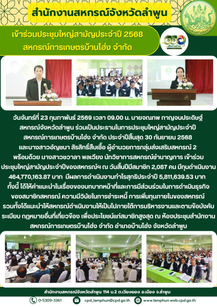 วันจันทร์ที่ 23 กุมภาพันธ์ 2569 เวลา 09.00 น. นายจณภพ กาญจนประดิษฐ์ สหกรณ์จังหวัดลำพูน ร่วมเป็นประธานในการประชุมใหญ่สามัญประจำปี สหกรณ์การเกษตรบ้านโฮ่ง จำกัด ประจำปีสิ้นสุด 30 กันยายน 2568 และนางสาวอัญชนา สิรสิทธิ์สืบเชื้อ ผู้อำนวยการกลุ่มส่งเสริมสหกรณ์ 2 พร้อมด้วย นางสาวชวาลา พลเวียง นักวิชาการสหกรณ์ชำนาญการ เข้าร่วมประชุมใหญ่สามัญประจำปีของสหกรณ์ฯ ณ วันสิ้นปีมีสมาชิก 2,087 คน มีทุนดำเนินงาน 464,770,163.87 บาท มีผลการดำเนินงานกำไรสุทธิประจำปี 5,811,639.53 บาท ทั้งนี้ ได้ให้คำแนะนำในเรื่องของบทบาทหน้าที่และการมีส่วนร่วมในการดำเนินธุรกิจของสมาชิกสหกรณ์ ความมีวินัยในการชำระหนี้ การเพิ่มทุนภายในของสหกรณ์ รวมทั้งได้แนะนำให้สหกรณ์ดำเนินงานให้เป็นไปภายใต้การบริหารงานและตามข้อบังคับ ระเบียบ กฎหมายอื่นที่เกี่ยวข้อง เพื่อประโยชน์แก่สมาชิกสูงสุด ณ ห้องประชุมสำนักงานสหกรณ์การเกษตรบ้านโฮ่ง จำกัด อำเภอบ้านโฮ่ง จังหวัดลำพูน