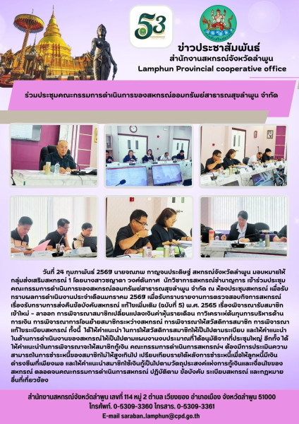 วันที่ 24 กุมภาพันธ์ 2569 นายจณภพ กาญจนประดิษฐ์ สหกรณ์จังหวัดลำพูน มอบหมายให้กลุ่มส่งเสริมสหกรณ์ 1 โดยนางสาวชญาดา วงศ์ตันกาศ นักวิชาการสหกรณ์ชำนาญการ เข้าร่วมประชุมคณะกรรมการดำเนินการของสหกรณ์ออมทรัพย์สาธารณสุขลำพูน จำกัด ณ ห้องประชุมสหกรณ์ เพื่อรับทราบผลการดำเนินงานประจำเดือนมกราคม 2569 เพื่อรับทราบรายงานการตรวจสอบกิจการสหกรณ์เรื่องรับทราบการส่งคืนข้อบังคับสหกรณ์ แก้ไขเพิ่มเติม (ฉบับที่ 5) พ.ศ. 2565 เรื่องพิจารณารับสมาชิกเข้าใหม่ - ลาออก การพิจารณาสมาชิกเปลี่ยนแปลงเงินค่าหุ้นรายเดือน กาวิเคราะห์ต้นทุนการบริหารด้านการเงิน การพิจารณาการโอนย้ายสมาชิกระหว่างสหกรณ์ การพิจารณาให้สวัสดิการสมาชิก การพิจารณาแก้ไขระเบียบสหกรณ์ ทั้งนี้ ได้ให้คำแนะนำ ในการให้สวัสดิการสมาชิกให้เป็นไปตามระเบียบ และให้คำแนะนำในด้านการดำเนินงานของสหกรณ์ให้เป็นไปตามแผนงานงบประมาณที่ได้อนุมัติจากที่ประชุมใหญ่ อีกทั้ง ได้ให้คำแนะนำในการพิจารณาจะให้สมาชิกกู้เงิน คณะกรรมการดำเนินการสหกรณ์ฯ ต้องมีการประเมินความสามารถในการชำระหนี้ของสมาชิกไม่ให้สูงเกินไป เปรียบเทียบรายได้หลังการชำระหนี้เพื่อให้ลูกหนี้มีเงินดำรงชีพที่เพียงพอ และให้คำแนะนำสมาชิกใช้เงินกู้เป็นไปตามวัตถุประสงค์แห่งการกู้เงินและเงื่อนไขของสหกรณ์ ตลอดจนคณะกรรมการดำเนินการสหกรณ์ ปฏิบัติตาม ข้อบังคับ ระเบียบสหกรณ์ และกฎหมายอื่นที่เกี่ยวข้อง