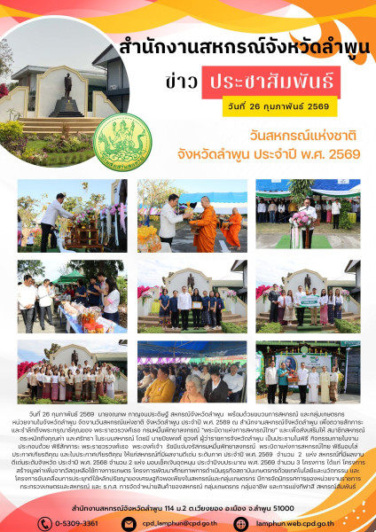 วันที่ 26 กุมภาพันธ์ 2569 นายจณภพ กาญจนประดิษฐ์ สหกรณ์จังหวัดลำพูน พร้อมด้วยขบวนการสหกรณ์ และกลุ่มเกษตรกร หน่วยงานในจังหวัดลำพูน จัดงานวันสหกรณ์แห่งชาติ จังหวัดลำพูน ประจำปี พ.ศ. 2569 ณ สำนักงานสหกรณ์จังหวัดลำพูน เพื่อถวายสักการะและรำลึกถึงพระกรุณาธิคุณของ พระราชวรวงศ์เธอ กรมหมื่นพิทยาลงกรณ์ “พระบิดาแห่งการสหกรณ์ไทย” และเพื่อส่งเสริมให้ สมาชิกสหกรณ์ตระหนักถึงคุณค่า และศรัทธา ในระบบสหกรณ์ โดยมี นายปิยพงศ์ ชูวงศ์ ผู้ว่าราชการจังหวัดลำพูน เป็นประธานในพิธี กิจกรรมภายในงานประกอบด้วย พิธีสักการะ พระราชวรวงศ์เธอ พระองค์เจ้า รัชนีแจ่มจรัสกรมหมื่นพิทยาลงกรณ์ พระบิดาแห่งการสหกรณ์ไทย พิธีมอบโล่ประกาศเกียรติคุณ และใบประกาศเกียรติคุณ ให้แก่สหกรณ์ที่มีผลงานดีเด่น ระดับภาค ประจำปี พ.ศ. 2569 จำนวน 2 แห่ง สหกรณ์ที่มีผลงานดีเด่นระดับจังหวัด ประจำปี พ.ศ. 2568 จำนวน 2 แห่ง มอบเช็คเงินอุดหนุน ประจำปีงบประมาณ พ.ศ. 2569 จำนวน 3 โครงการ ได้แก่ โครงการสร้างมูลค่าเพิ่มจากวัสดุเหลือใช้ทางการเกษตร โครงการพัฒนาศักยภาพการดำเนินธุรกิจสถาบันเกษตรกรด้วยเทคโนโลยีและนวัตกรรม และโครงการขับเคลื่อนการประยุกต์ใช้หลักปรัชญาของเศรษฐกิจพอเพียงในสหกรณ์และกลุ่มเกษตรกร มีการจัดนิทรรศการของหน่วยงานราชการกระทรวงเกษตรและสหกรณ์ และ ธ.ก.ส. การจัดจำหน่ายสินค้าของสหกรณ์ กลุ่มเกษตรกร กลุ่มอาชีพ และการแข่งกีฬาสี สหกรณ์สัมพันธ์