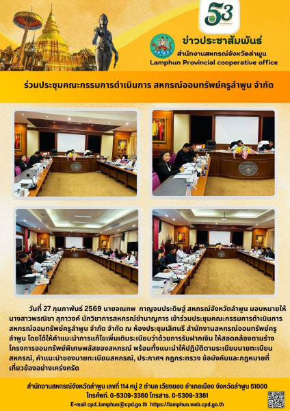 วันที่ 27 กุมภาพันธ์ 2569 นายจณภพ กาญจนประดิษฐ์ สหกรณ์จังหวัดลำพูน มอบหมายให้ นางสาวพรณิชา สุภาวงค์ นักวิชาการสหกรณ์ชำนาญการ เข้าร่วมประชุมคณะกรรมการดำเนินการ สหกรณ์ออมทรัพย์ครูลำพูน จำกัด ณ ห้องประชุมเลิศนรี สำนักงานสหกรณ์ออมทรัพย์ครูลำพูน โดยได้ให้คำแนะนำการแก้ไขเพิ่มเติมระเบียบว่าด้วยการรับฝากเงิน ให้สอดคล้องตามร่างโครงการออมทรัพย์พิเศษพลัสของสหกรณ์ พร้อมทั้งแนะนำให้ปฏิบัติตามระเบียบนายทะเบียนสหกรณ์, คำแนะนำของนายทะเบียนสหกรณ์, ประกาศฯ กฎกระทรวง ข้อบังคับและกฎหมายที่เกี่ยวข้องอย่างเคร่งครัด