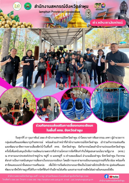 วันที่ 27 กุมภาพันธ์ 2569 สำนักงานสหกรณ์จังหวัดลำพูน นำโดยนางสาวพิมลวรรณ เคหา ผู้อำนวยการกลุ่มส่งเสริมและพัฒนาธุรกิจสหกรณ์ พร้อมด้วยเจ้าหน้าที่สำนักงานสหกรณ์จังหวัดลำพูน เข้าร่วมกิจกรรมส่งเสริมและพัฒนาอาชีพการเพาะเลี้ยงสัตว์น้ำในพื้นที่ คทช. จังหวัดลำพูน จัดกิจกรรมโดยสำนักงานประมงจังหวัดลำพูน ครั้งนี้เพื่อสนับสนุนปัจจัยการผลิตแก่เกษตรกรที่เข้าร่วมโครงการจัดที่ดินทำกินให้ชุมชนตามนโยบายรัฐบาล (คทช.) ณ ศาลาอเนกประสงค์ประจำหมู่บ้าน หมู่ที่ 10 และหมู่ที่ 14 ตำบลมะเขือแจ้ อำเภอเมืองลำพูน จังหวัดลำพูน กิจกรรมดังกล่าวเป็นการสนับสนุนการเลี้ยงกบในระบบกระชังบก โดยมีการแจกจ่ายกระชังบกและอุปกรณ์ที่เกี่ยวข้อง พร้อมทั้งสาธิตและแนะนำขั้นตอนการเตรียมบ่อ เพื่อให้การเริ่มต้นประกอบอาชีพเป็นไปอย่างมีประสิทธิภาพ มุ่งส่งเสริมและพัฒนาอาชีพให้ราษฎรที่ได้รับการจัดที่ดินทำกินมีรายได้เสริม และสามารถดำรงชีพได้อย่างมั่นคงและยั่งยืน