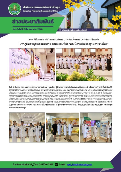 วันที่ 2 มีนาคม 2569 เวลา 08.30 น.นางสาวปภิณพร มูลเมือง ผู้อำนวยการกลุ่มจัดตั้งและส่งเสริมสหกรณ์ พร้อมด้วยเจ้าหน้าที่ เข้าร่วมพิธีถวายราชสักการะแด่พระบาทสมเด็จพระบรมชนกาธิเบศร มหาภูมิพลอดุลยเดชมหาราช บรมนาถบพิตร“พระบิดาแห่งมาตรฐานการช่างไทย” เพื่อเป็นการน้อมรำลึกในพระมหากรุณาธิคุณอย่างหาที่สุดมิได้ พิธีดังกล่าวจัดขึ้นเพื่อรำลึกถึงพระราชดำรัสเมื่อ พ.ศ. 2513 ที่ทรงเน้นย้ำความสำคัญของช่างฝีมือในฐานะกลไกหลักของการพัฒนาประเทศ ซึ่งเป็นแนวทางในการพัฒนาความรู้ ฝีมือ และการจัดหางานให้สอดคล้องกัน เพื่อยกระดับคุณภาพสินค้าและบริการของประเทศทั้งนี้ คณะรัฐมนตรีมีมติเมื่อวันที่ 17 กุมภาพันธ์ 2552 ถวายพระราชสมัญญา “พระบิดาแห่งมาตรฐานการช่างไทย” และกำหนดให้วันที่ 2 มีนาคมของทุกปี เป็นวันมาตรฐานฝีมือแรงงานแห่งชาติ โดย กระทรวงแรงงาน น้อมนำพระราชดำริไปสู่การพัฒนากำลังแรงงานของประเทศโดยมีนายปิยพงศ์ ชูวงศ์ ผู้ว่าราชการจังหวัดลำพูน เป็นประธานในพิธี ณ หอประชุมจังหวัดลำพูน ศาลากลางจังหวัดลำพูน